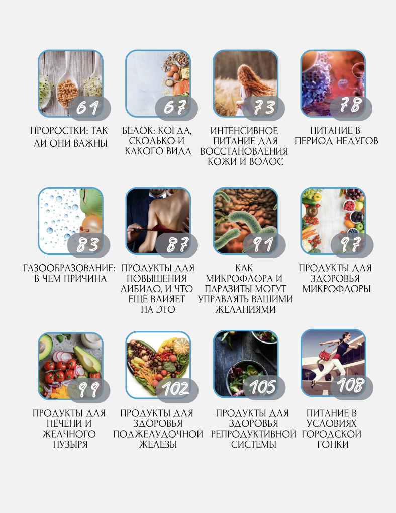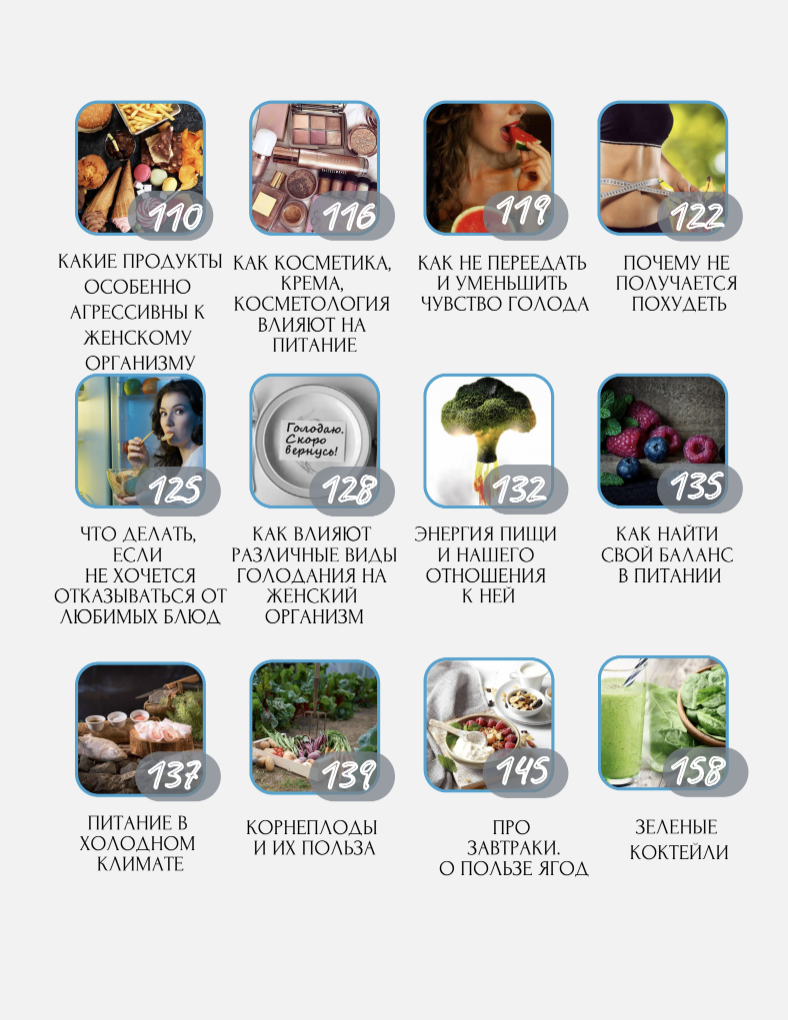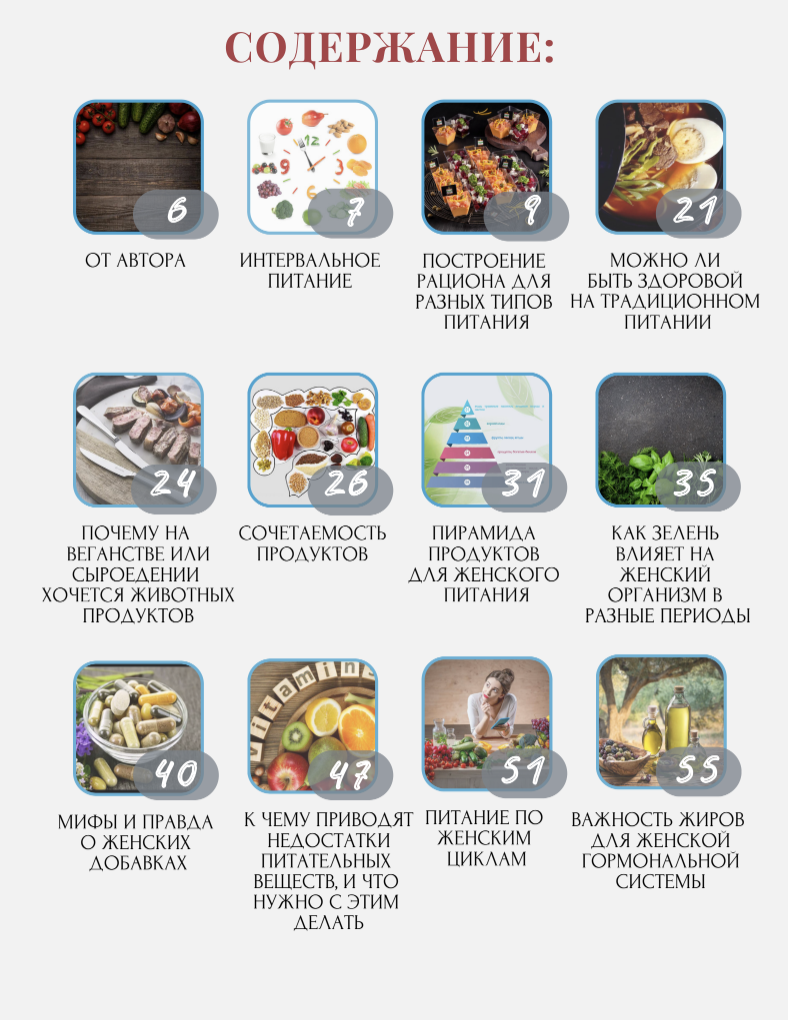 Темы, которые раскрыли в полной мере: • Принципы питания для здоровья • В чём отличие женского и не женского питания • Распорядок дня в приёме пищи • Интервальное питание • Рацион питания для разных типов питания: сыроедение, веганство, традиционное питание • Почему на веганстве или сыроедении иногда вдруг хочется животных продуктов • Можно ли быть здоровой на традиционном питании • Питание в условиях городской гонки • Как зелень влияет на женский организм в разные периоды • Проростки так ли они важны • Газообразование. Какая причина • Пирамида продуктов для женского питания • Сочетаемость продуктов. Всё намного проще • Питание по женским циклам • Продукты для повышения либидо. И что на это влияет ещё • Белок! Когда, сколько и какого вида • Мифы и правда о женских добавках • К чему приводят недостатки питательных веществ и что нужно с этим делать • Питание в период недугов • Интенсивное питание для восстановления кожи и волос • Питание по женским циклам • Продукты для повышения либидо. И что на это влияет ещё • Белок! Когда, сколько и какого вида • Мифы и правда о женских добавках • К чему приводят недостатки питательных веществ и что нужно с этим делать • Питание в период недугов • Интенсивное питание для восстановления кожи и волос • Какие продукты особенно агрессивны к женскому организму • Как косметика, крема, косметология влияют на питание • Как не переедать и уменьшить чувство голода • Почему не получается похудеть • Вкусные вечерние чаи • Как влияют различные виды голодания на женский организм • Важность жиров для женской гормональной системы • Энергия пищи и нашего отношения к ней • Как найти свой баланс в питании • Что делать, если не хочется отказываться от любимых блюд